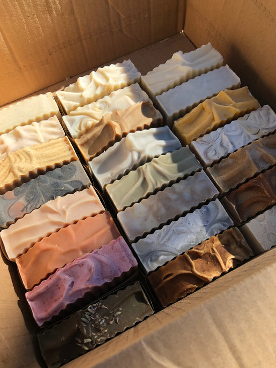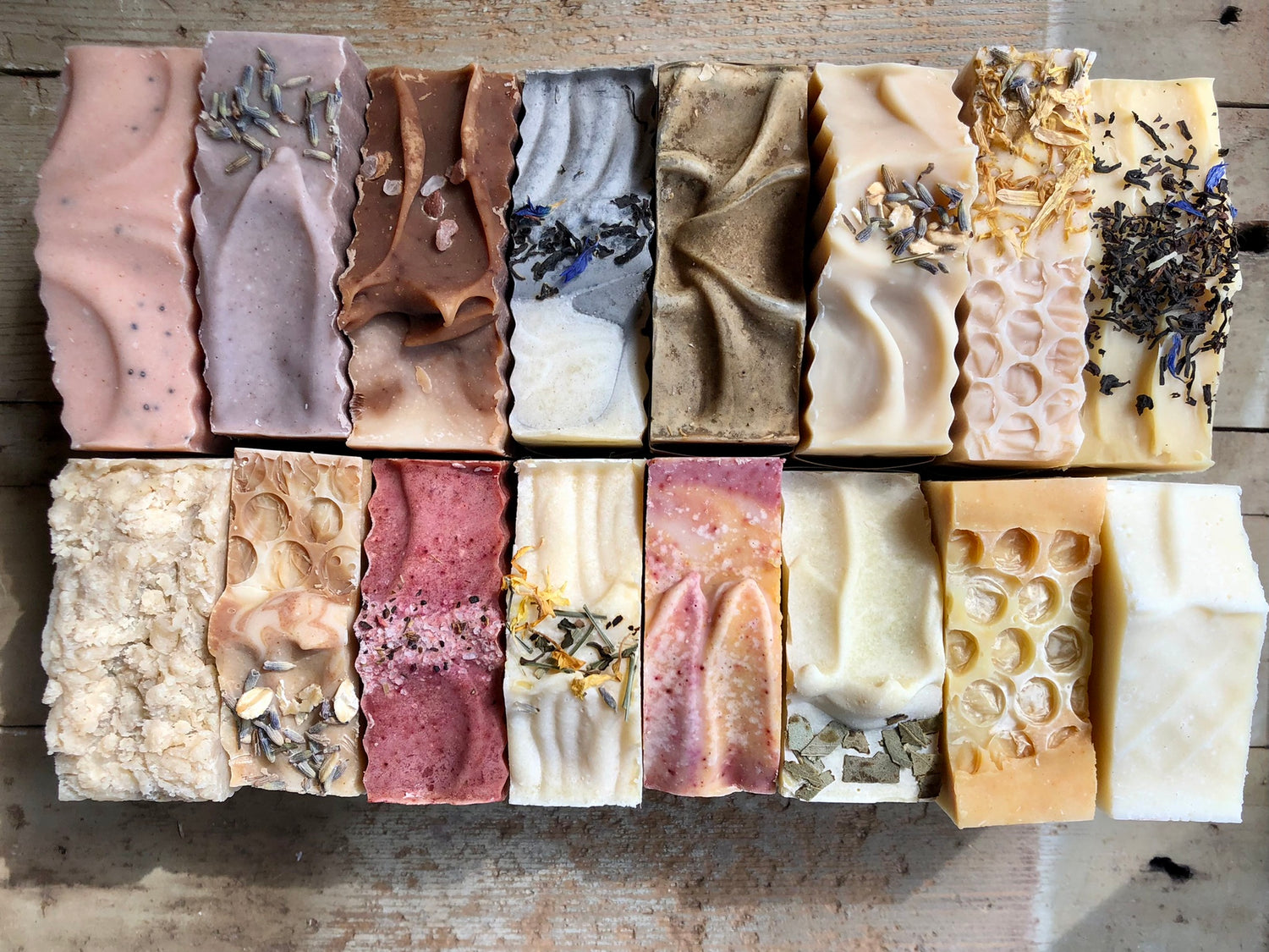 We use natural additives such as activated charcoal, coffee grounds, cocoa powder, spirulina, turmeric, clays, chlorella, agave syrup, honey, colloidal oatmeal, herbal teas, botanicals, walnut shell powder, sea salt and more to give our soaps color and special effects. All beeswax and honey are locally sourced. No micas or dyes. If you have any known food allergies, please read ingredients carefully.
